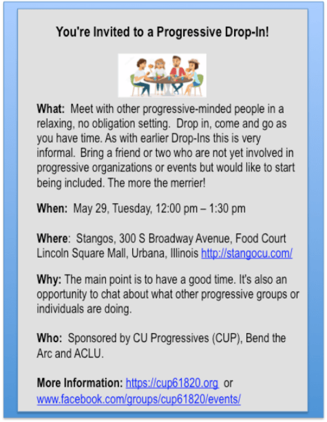 Join CUP and Bend the Arc at the next Progressive Drop-In at Jupiters on Tuesday, May 29, 12:00 pm – 1:30 pm, at Stangos in Lincoln Square Mall. Stangos is a new restaurant serving Zambian/African cuisine. Feel free to bring a friend.