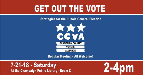 Come to the Champaign Public Library on Saturday, July 21, 2:00 pm – 4:00 pm to hear about the next steps by the Champaign County Voters Alliance in geting out the vote. Below is a message from the CCVA Facebook page.