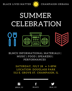 You don’t want to miss this! Come share some joy with your local Black Lives Matter chapter! Join the celebration on Saturday, July 28, 5:00 pm – 8:00 pm, Douglass Park, 512 E Grove St, Champaign. BLMCU information materials, music, food, speakers and performances. Food catered by Carribbean Grill and DJ Terrance Stevenson on music!