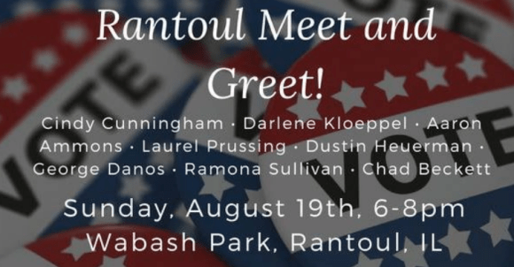 A good chance to meet a bunch of local candidates all at once: Cindy Cunningham, Darlene Kloeppel, Aaaron Ammons, Laurel Prussing, Dustin Heuerman, George Danos, Ramona Sullivan and Chad Becket. What a good use of time! Join them on Sunday, August 19, 6:00 pm – 8:00 pm, in Wabash Park, Rantoul IL.