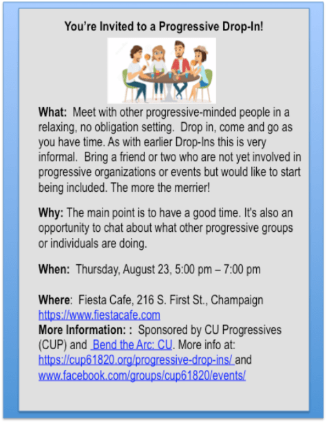 Join CUP and Bend the Arc at the eighth Progressive Drop-In at Fiesta Cafe on Thursday, August 23, 5:00 pm – 7:00 pm, at Fiesta Cafe, 216 S. First St., Champaign https://www.fiestacafe.com. This will be the only drop-in this month, so don’t miss it! Below is a flyer for the event. More information on Drop-Ins at: Progressive Drop-Ins.
