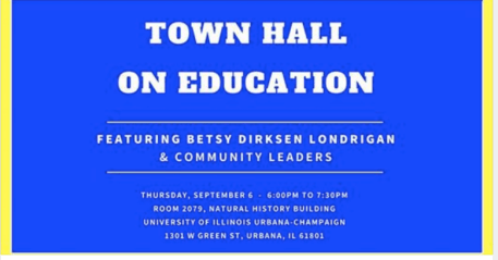 y Dirksen Londrigan and Community Leaders on Thursday, September 6, 6:00 pm – 7:30 pm, for a Town Hall on Education. The location is on the UI Campus, in the Natural History Building, 1301 W Green St, Champaign. Meet the candidate and for Congress and talk with her about the issues. Sign up here. For more information, see the Facebook event.