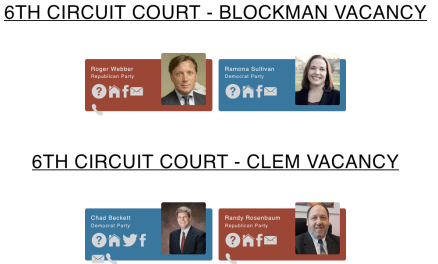 The Champaign County Voter’s Alliance Candidate Guide has survey responses from both Democratic and Republican candidates at county, state and federal levels. On the State Candidates page, scroll down to see the 6th Circuit seats that are open this year. Click on the icons to get basic information and candidate statements. It’s very useful for getting a feeling for each candidate, all in one spot.