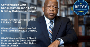 Betsy Dirksen Londrigan, and the NAACP Decatur Branch & Church of the Living God CWFF, is honored to welcome Civil Rights Icon & Congressman John Lewis to the 13th District! Please join them at a free event open to the public in Decatur on Tuesday, October 16 from 2:30 PM to 3:15 PM at Church of the Living God CWFF, 400 S Franklin St. Hope you can join us! #IL13 #TeamBetsy