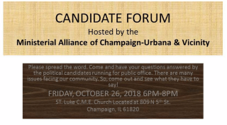 Please spread the word. Come and have your questions answered by the political candidates running for public office. There are many issues facing our community. So, come out and hear what they have to say! The forum will be held Friday, October 26, 6:00 pm – 8:00 pm at the St Luke’s Christian Methodist, 809 N 5th St, Champaign. Hosted by Ministerial Alliance of Champaign-Urbana & Vicinity. For more information see the Facebook event.