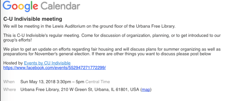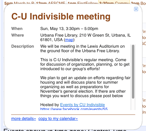 In any view, once you find an event of interest, you can select it by clicking on the name of the event. A small box will pop open, in front of the calendar. Here’s the kind of detail you’ll see for your selected event: