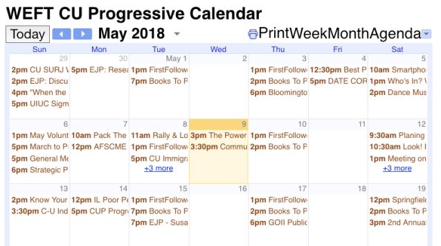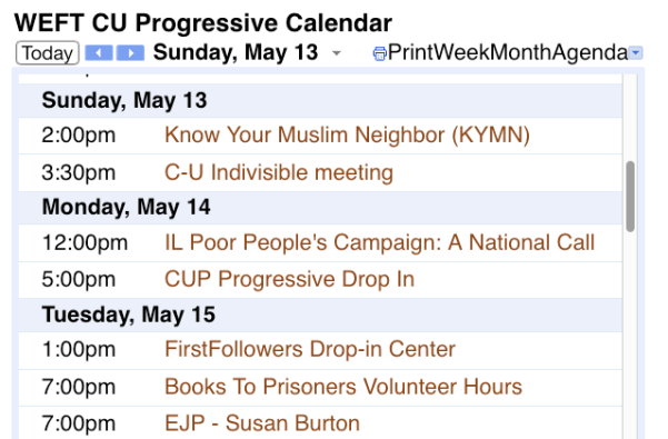 All of the Calendars on this site open up in Agenda view. To switch to a Month View, clock on the word “Month” in the upper right corner. If you are accessing the WEFT CU Progressive Calendar from the WEFT site (www.weft.org/progressive) it will start in Month view. Click on Agenda to change the view.